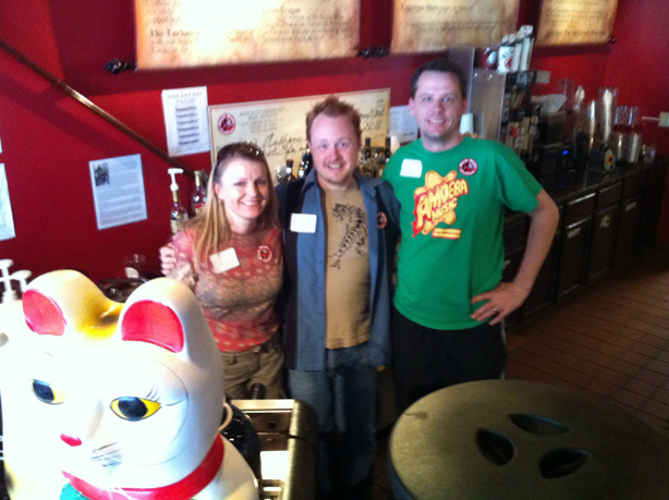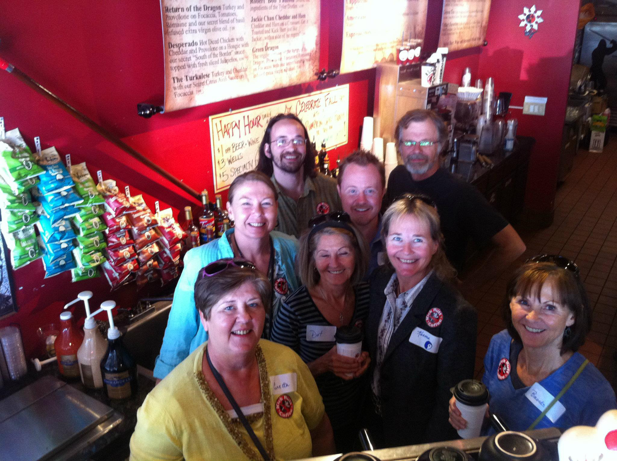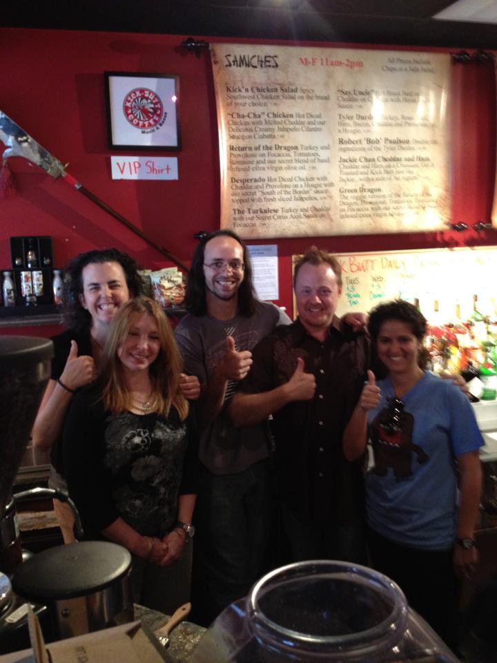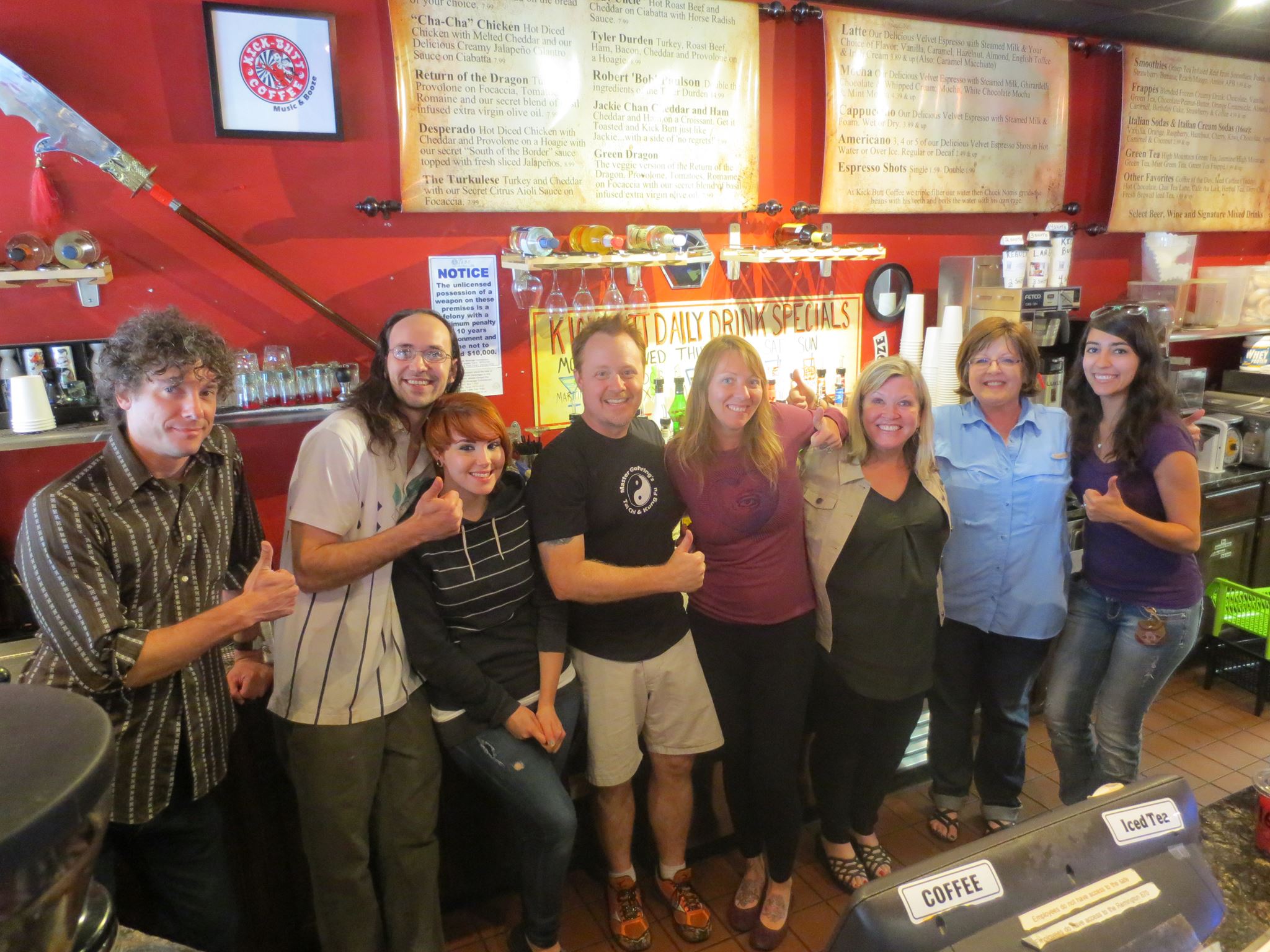 BTW: Deadly weapons adorn the wall and also help to guard Kick Butt Coffee grounds from caffeine junkies.